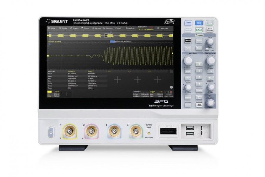 | Входы выходы | Передняя панель: USB 2.0 Host (2), Выход калибратора 1 кГц, 3 В меандр Задняя панель: USB 2.0 Host, USB 2.0 Device, LAN 10/100MbaseT (RJ45), слот Micro SD Card, External Trigger: ВНЕШ: ≤1,5 Вскз,ВНЕШ/5: ≤ 7,5 Вскз Auxiliary Output: Выход синхр. (3,3 В LVCMOS), Доп.Контр. Выход (3,3 В TTL) |